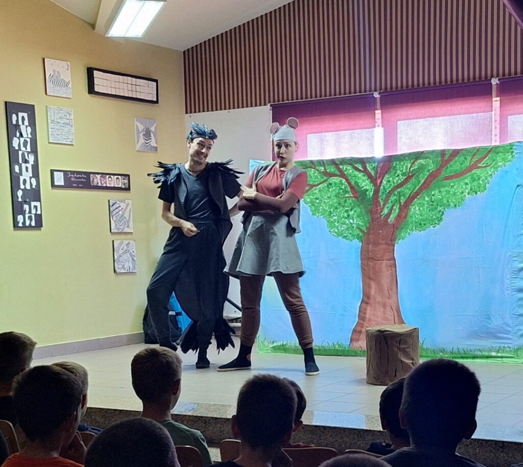 Zabavna i poučna predstava odigrala se proteklog petka, 10. listopada, na školskoj pozornici. Općina Pićan je i ove godine u Dječjem tjednu darovala našim učenicima kazališnu predstavu u kojoj su uživali učenici od 1. do 4. razreda matične i područnih škola. Teatar Naranča nam je i ovog puta priredio pregršt smiješnih trenutaka u izvedbi Ezopove basne „Gavran i lisica“. Kroz mnoštvo zanimljivih i dovitljivih dijaloga dvoje odličnih mladih glumaca, Jona Zupković i Gabrijel Perić, prikazalo je kritiku narcisoidnosti i umišljenosti te istaknulo važnost pravog prijateljstva i zajedništva.